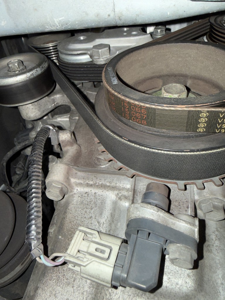写真真ん中の上にあるベルトがかかっている部品がオートテンショナーです。部品を注文にして交換をして空ぶかしでも走り始めでも異音はおさまりました。メーカーは違えど同じようなテンショナーを使っている車種は同じような音がするのでもしいつもと違う感じの音が聞こえたら点検に来てくださいな ではでは!サービスのセキガミでした!