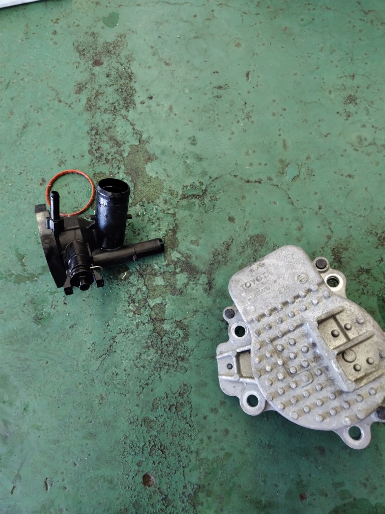 というわけでですね、調べてみるとウォーターポンプとサーモスタットから結構、冷却水が漏れていまして、トヨタ車でしたのでピンク色の冷却水の跡がガッツリと残っておりまして…あぁ…これだぁ…となりまして…