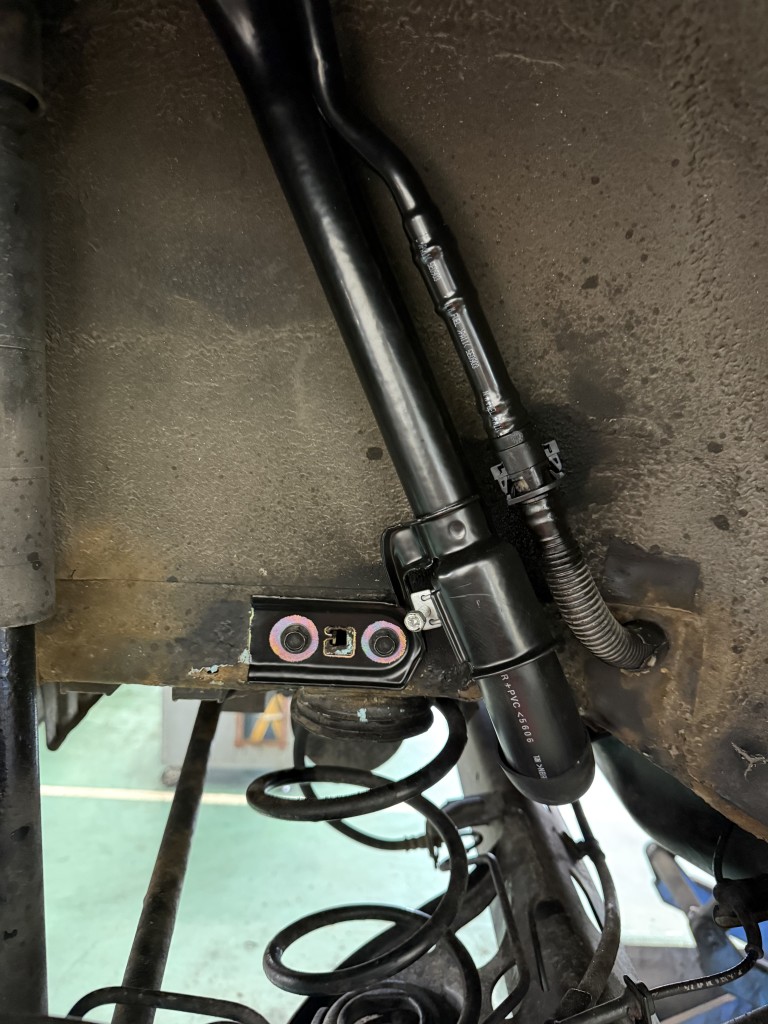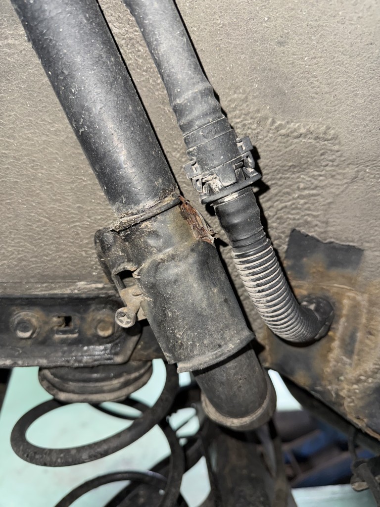 左側の太いパイプの真ん中あたりが腐食してそこからガソリンが給油の際に漏れてきたみたいです部品屋さんに手配をして揃ったので交換作業です。幸いお客様がガソリンが漏れているので満タンにしてなかったので、パイプ&ホースを外してもガソリンが出てくることはなく安全に作業を進めることができました。