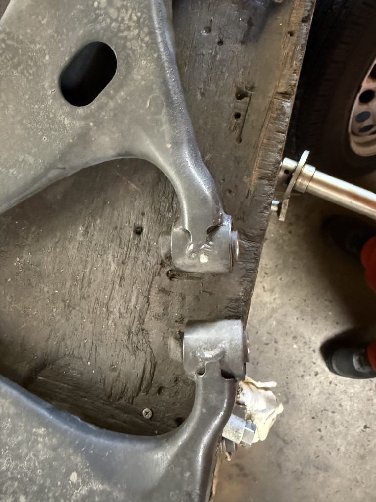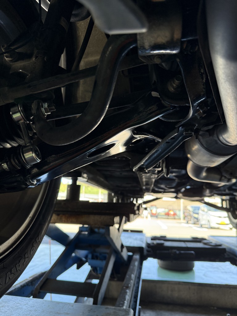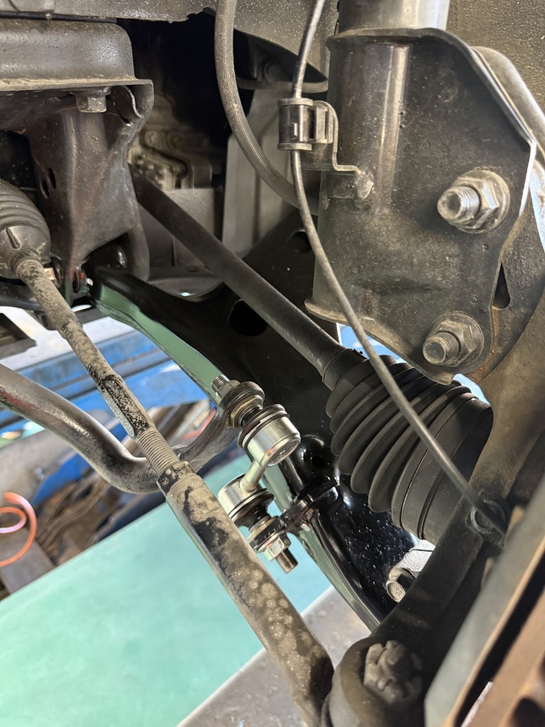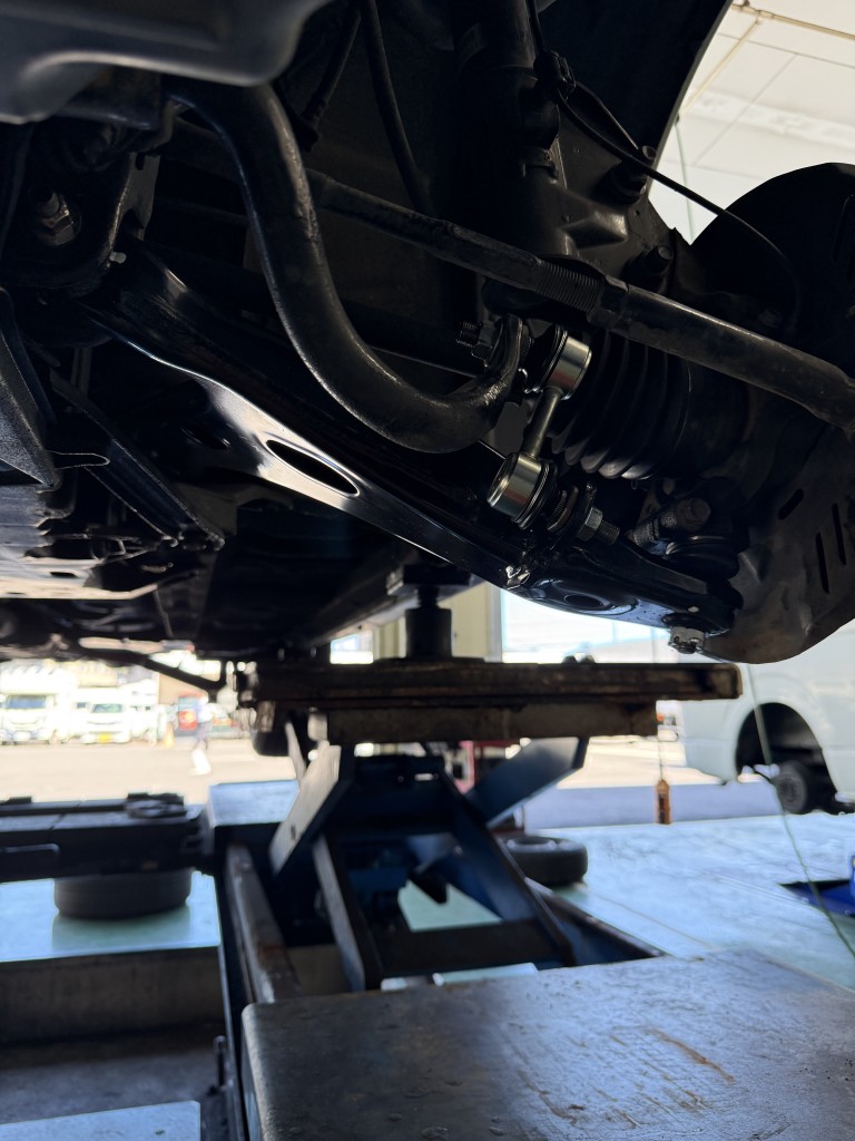 今日は走行中振動する車について書きたいと思います。車はスバルフォレスターSJ5の型式になります。年式は26年式で走行距離は7万キロほど。症状は60キロ位で車体全体が震えるとの事試運転してみたらやはり同じ速度域で振動し始めます。そこからスピードを落とせば振動も止まり違和感なく走れました。工場に戻りリフトであげて下回りの点検です。ブレーキの引きずりはなしハブベアリングのガタもなし。しかしタイタを左右に振るとガタがあり見てみるとフロントロワアームの前側のブッシュがガタ付きがありました。