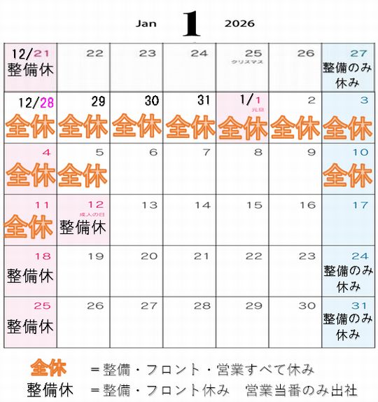年末年始の営業 お知らせ オートガード八戸のスケジュールカレンダーです。 無印の日は通常営業となります。 定休日以外の営業時間は 9:00~17:30 です。 ご来店予定、入庫予約の確認等にご利用ください。 年末年始は12/28~1/5まで休業となります。1/6より通常営業となります。 入庫の予約日程はフロント又は担当者と打ち合わせの上お願い致します。