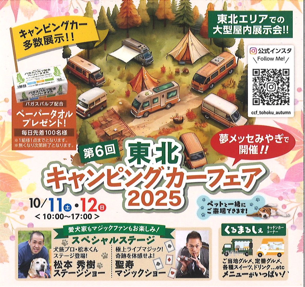 来る10/11㈯~12㈰の二日間、仙台夢メッセにて「東北キャンピングカーフェア」が開催されます。