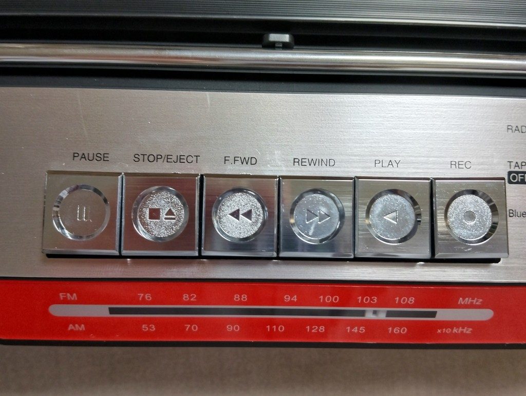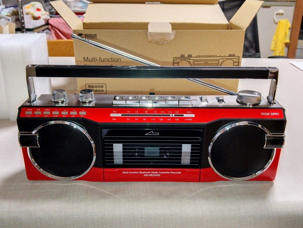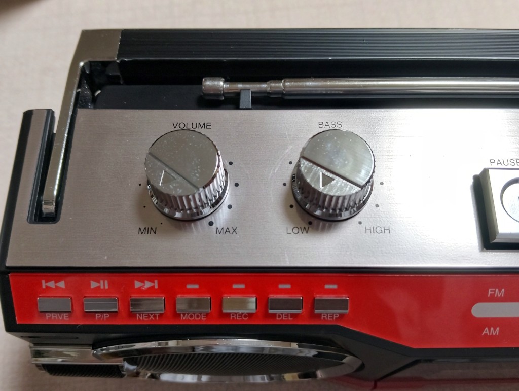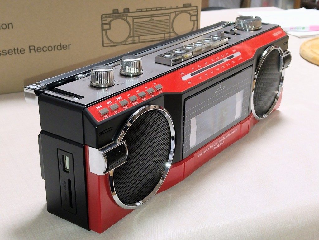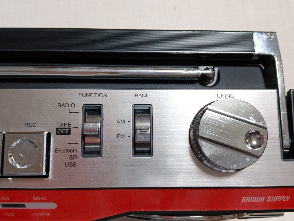 今どきのラジカセ Tweet 前回のラジカセについてもう少し詳しく紹介します。 カセット操作部とラジオ選曲スケール 音量ボリュームとBASS音ボリューム 右から、選曲ダイヤル・バンド切替 Function切替はラジオ・テープ・(Bluetooth・SD・USB) 左側面にSDカードとUSBメモリ接続できます。右側面にはヘッドホン端子あり。 新旧メディアが使える便利なラジカセです。AC100Vコード付属、単2x4本でも使えるので、災害時にも役に立ちます。 1家に1台いかがでしょうか? ロッキー土橋 Tweet